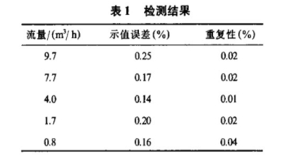 該電磁流量計已經(jīng)得到應用,并依據(jù)JJG198-94《速度式流量計檢定規(guī)程》,利用質(zhì)量法水標準裝置,對采用基波平均值信號預處理電路的電磁流量計進行檢定,重復性誤差為0.1%,基本誤差為0.25%,線性度0.3%,檢測結果如表1.