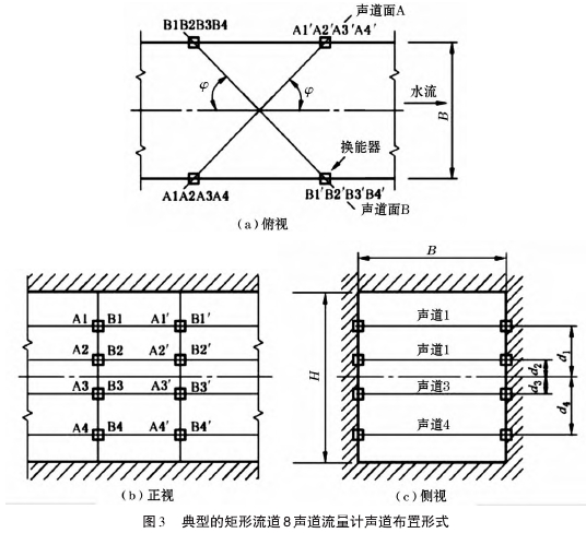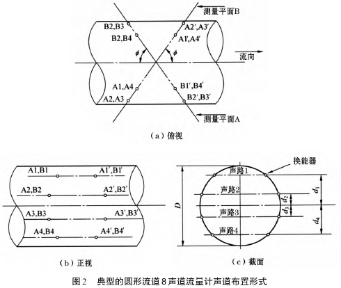 超聲波流量計(jì)是在上述原理的基礎(chǔ)上,在流道內(nèi)按照--定的規(guī)則設(shè)置多條聲道,將各條聲道測(cè)得的流道軸向線平均流速采用相應(yīng)的積分方法進(jìn)行積分計(jì)算,從而得到流道內(nèi)流體的總流量。這種時(shí)差式超聲波流量計(jì)方案,能夠利用常年“暢流期”條件,有利于泵站水量計(jì)算,避免了人為選擇推流計(jì)算參數(shù)而引起較大誤差的問題。