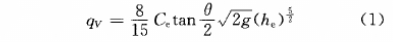 式中:qv--體積流量,m³/s;Ce--流量系數(shù)(需查表);θ--角缺口夾角,20°≤θ≤100°;he--有效水頭,m,he=h+Kh(h-實(shí)測水頭,m,Kh--水頭修正系數(shù))。