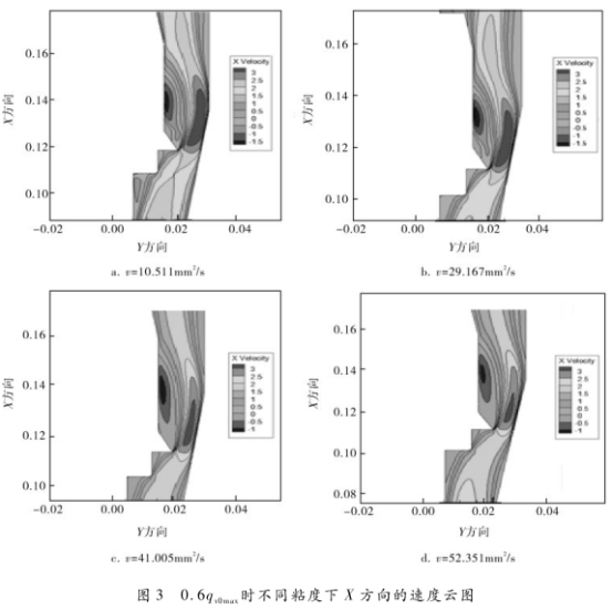 為了直觀地反映同一流量點不同粘度下流量傳感器中速度的變化,選取0.6qyDmax時不同粘度.下X方向速度進(jìn)行分析,速度云圖如圖3所示。