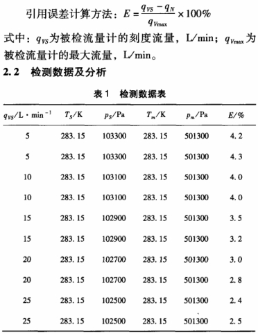 選用標(biāo)準(zhǔn)氣表,對(duì)高金屬管浮子流量計(jì)進(jìn)行在線實(shí)流檢測(cè)。當(dāng)標(biāo)準(zhǔn)氣表和被檢測(cè)流量計(jì)的流量達(dá)到穩(wěn)定時(shí),讀取標(biāo)準(zhǔn)氣表和被檢測(cè)流量計(jì)的指示流量,記錄標(biāo)準(zhǔn)氣表和被檢測(cè)流量計(jì)進(jìn)口處的壓力、溫度,計(jì)算被檢測(cè)流量計(jì)的實(shí)際流量。工作介質(zhì)經(jīng)過(guò)在線高壓被檢浮子流量計(jì)后,氣體壓力大幅度降低,進(jìn)人標(biāo)準(zhǔn)氣表的氣體壓力已是常壓,所以被檢高壓浮子流量計(jì)和標(biāo)準(zhǔn)氣表都可正常工作。